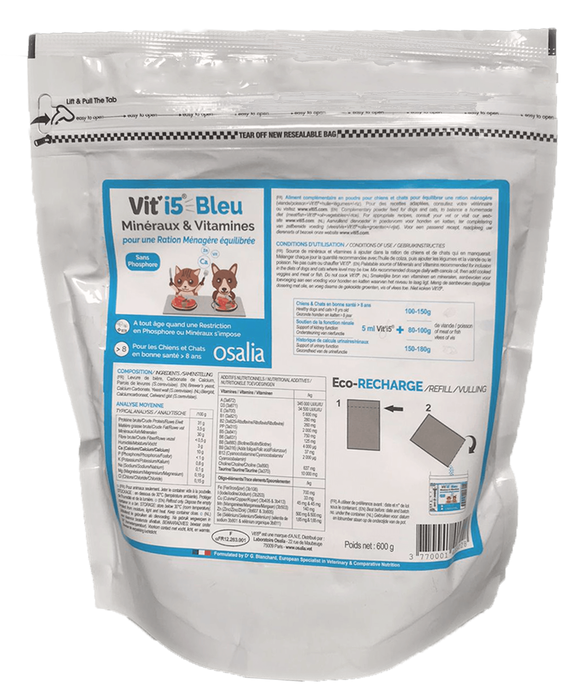 Minerals and vitamins feed recommended to balance the homemade diet of senior dogs and cats (> 8 years old) in good health, or dogs and cats of any age with a pathology requiring a restriction in phosphorus and minerals (renal failure, heart failure , urolithiasis).