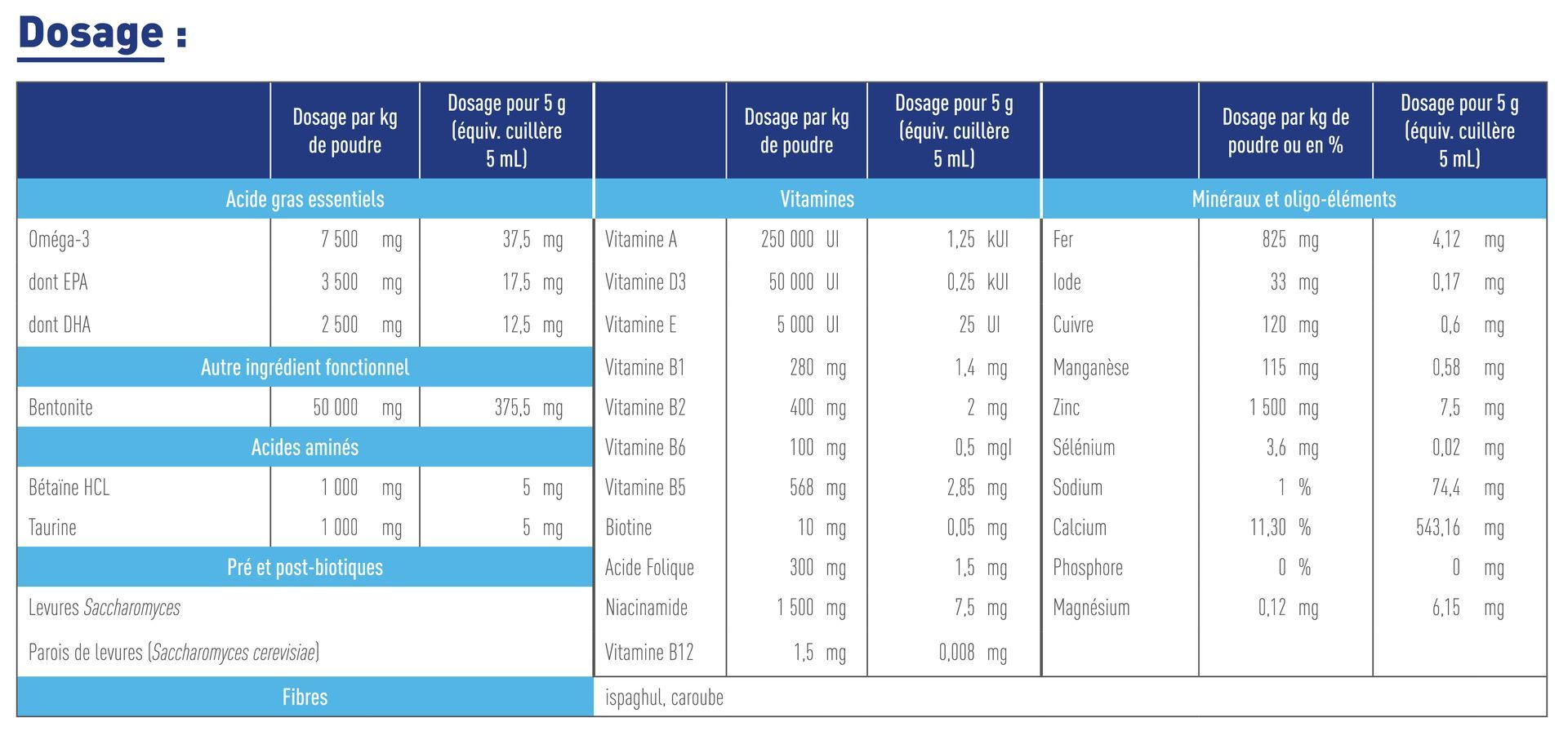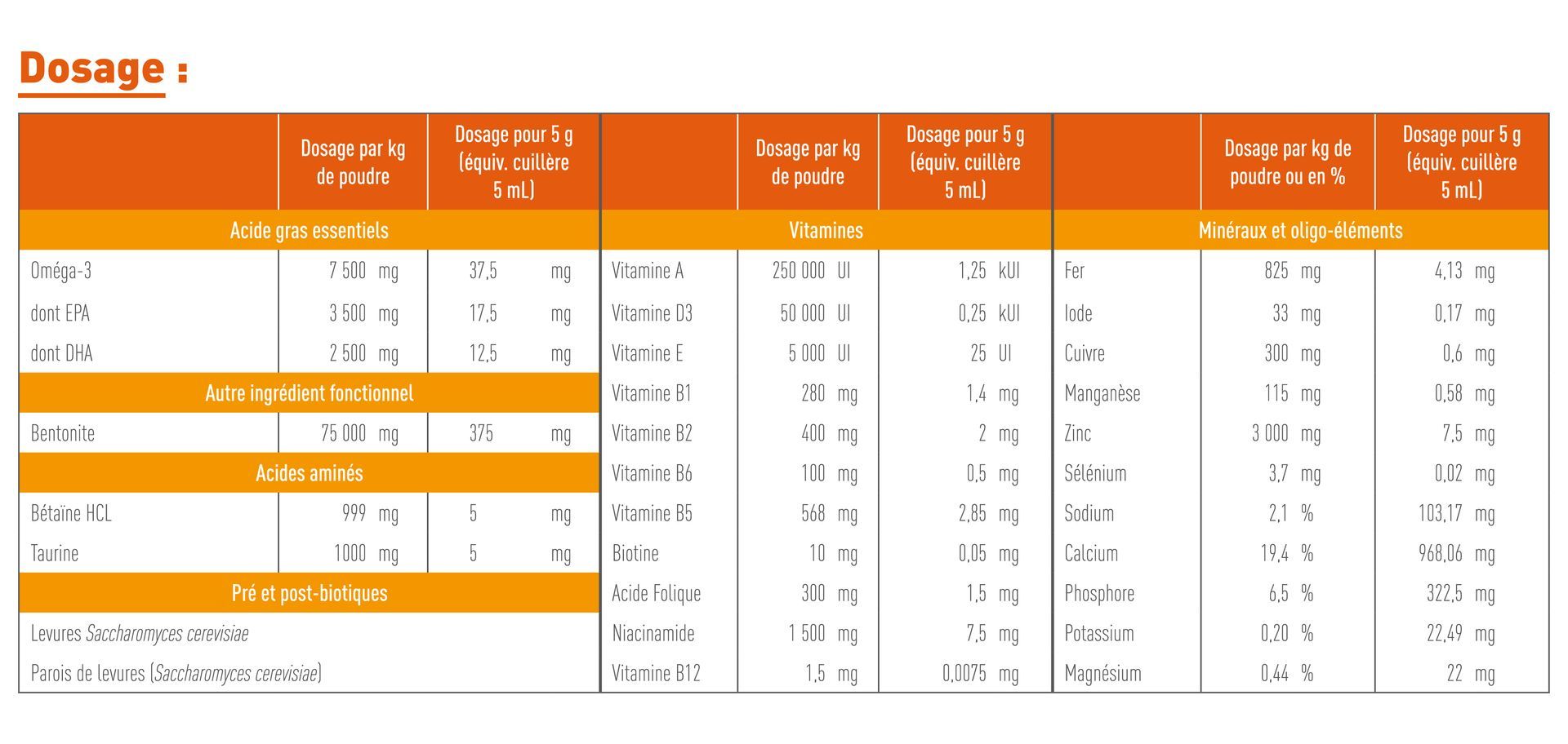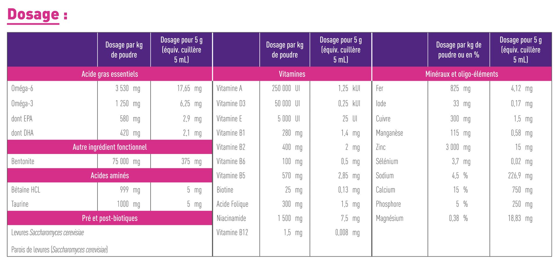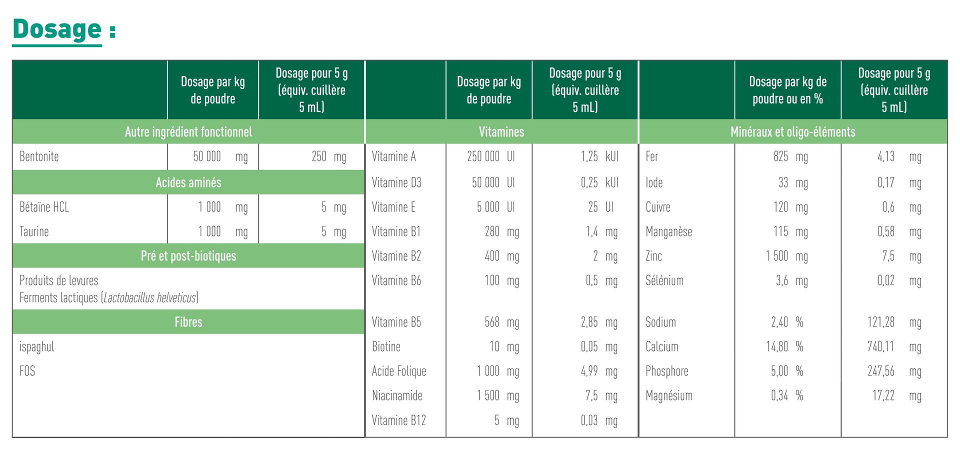 5g ou une cuillère à café rase dans 100-150g de viande/oeuf/poisson pour équilibrer la ration ménagère.